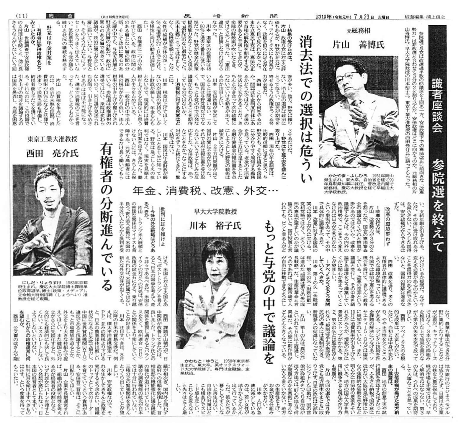 長崎新聞 「識者座談会『参院選を終えて』もっと与党の中で議論を」